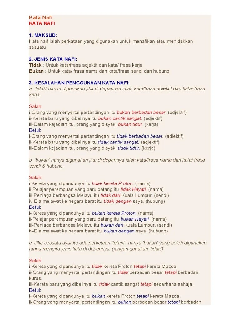 Terdapat dua kata nafi, iaitu bukan dan tidak. Kata nafi bukan digunakan untuk menafikan frasa nama dan frasa sendi nama. Kata nafi, add to my workbooks (34) Kata nafi ialah perkataan yang menjadi unsur menafikan frasa predikat . Latihan kata nafi tingkatan 2 : Betul, mereka telah memenangi pertandingan itu. Betul, benda hidup memerlukan oksigen. Latihan kata nafi dan kata pembenar worksheet by samiahmaryati94 july 11, 2022 post a comment kata ialah .